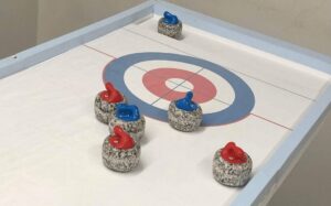 カーレットとは、卓上で行うカーリングで、手のひらサイズのストーンを卓上ですべらせて競います。