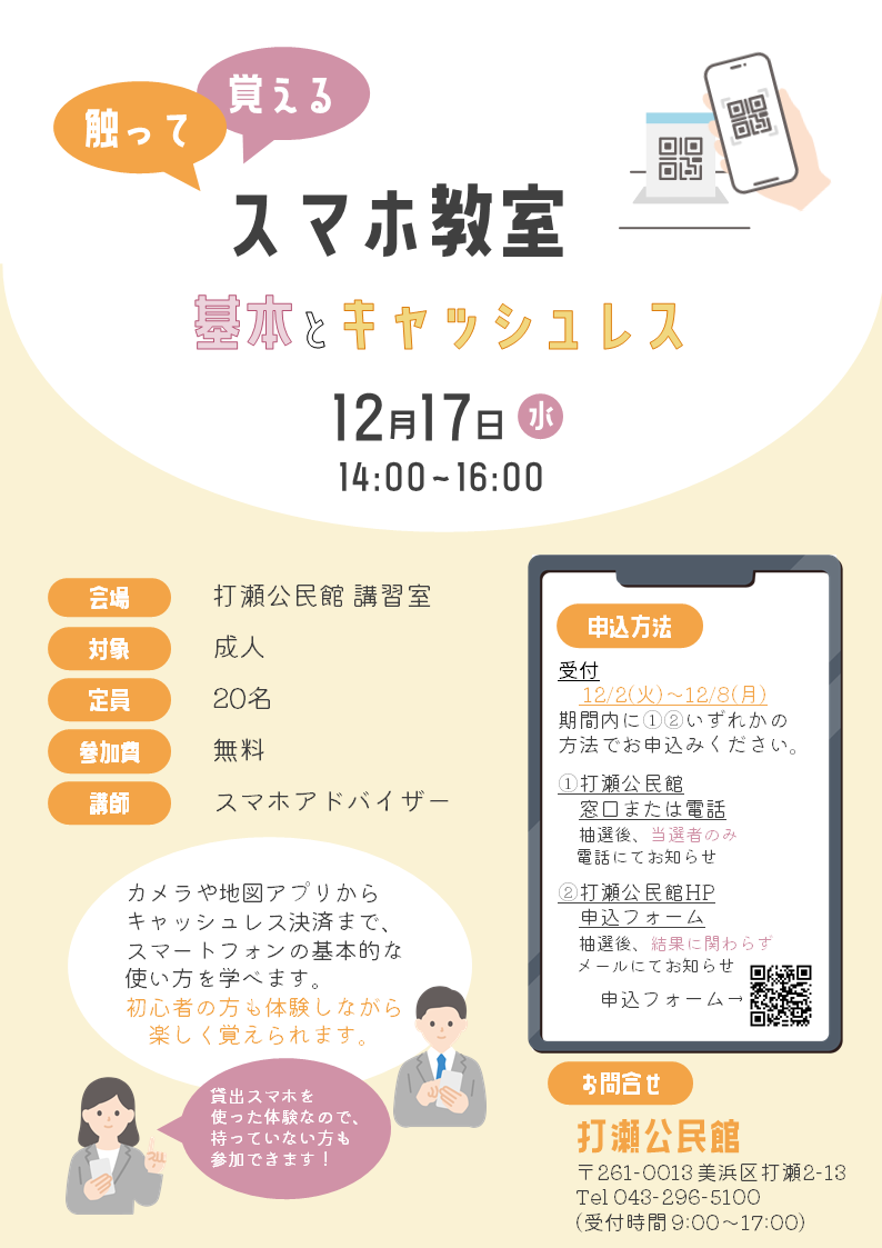 ◆申込方法 窓口、電話(TEL043-263-0268)、申込みフォーム(生浜公民館HPお知らせ欄よりアクセス)