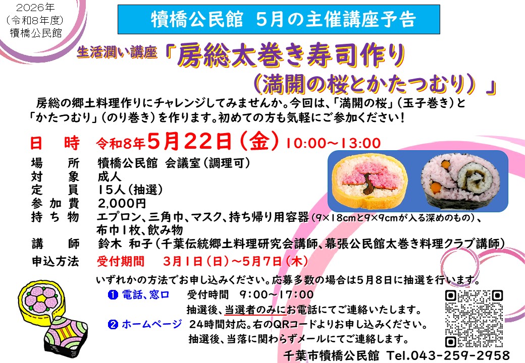 房総の郷土料理作りにチャレンジしてみませんか。今回は、「満開の桜」(玉子巻き)と「かたつむり」(のり巻き)を作ります。初めての方も気軽にご参加ください!