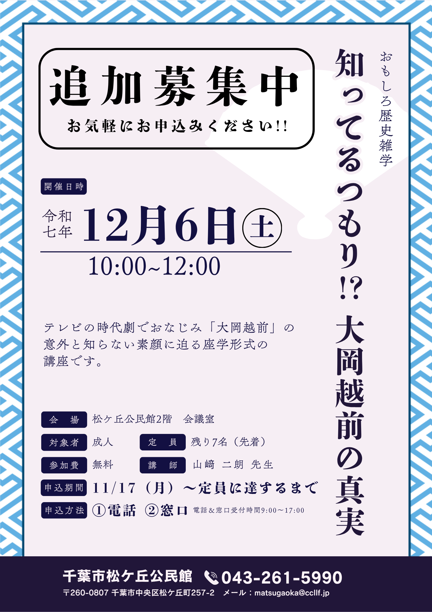 (追加募集中)12/6(土)10:00~12:00おもしろ歴史雑学「知ってるつもり?! 大岡越前の真実」申込