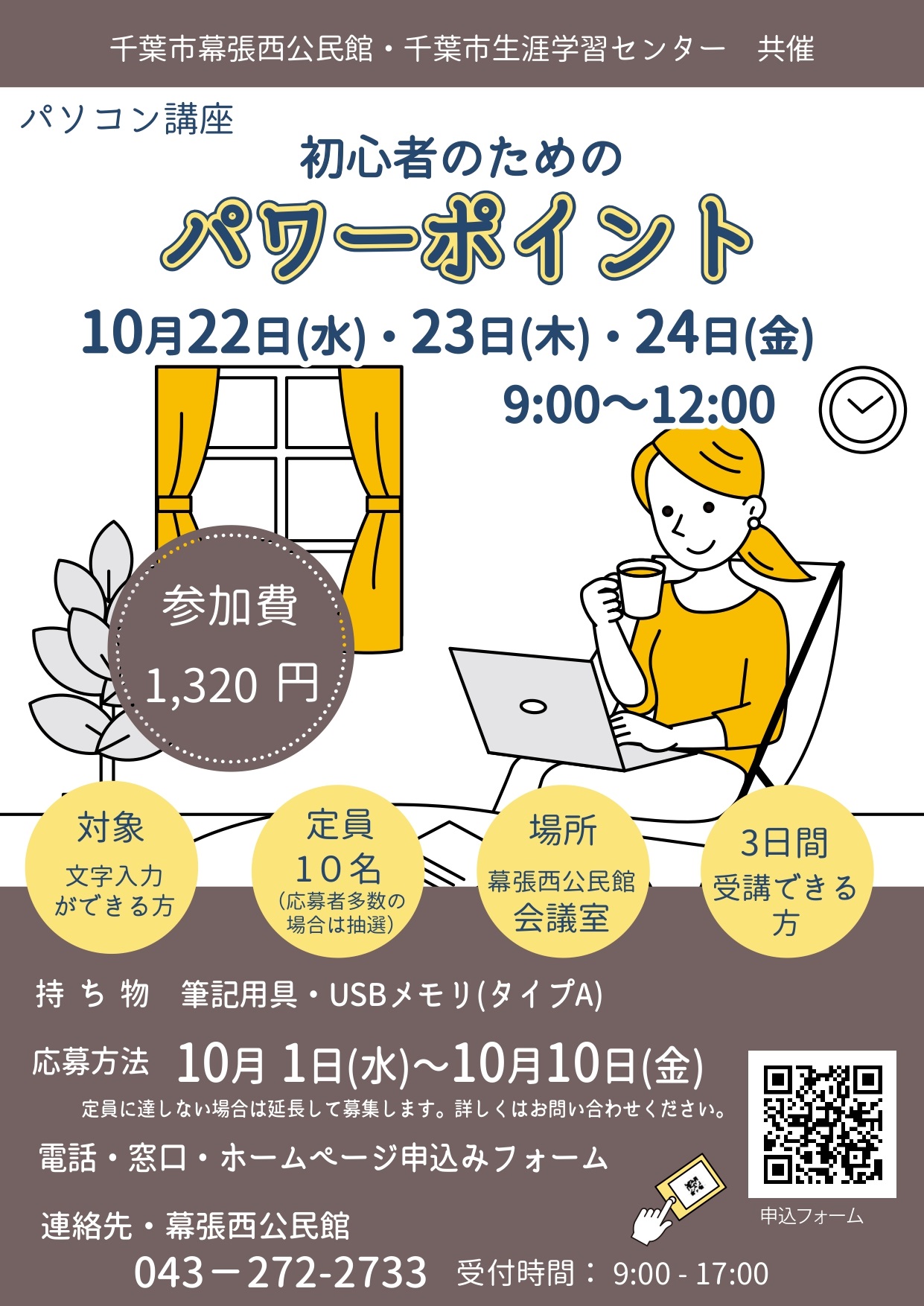 【お願い】 ・講座中、記録用として写真を撮らせていただきます。また、公民館だよりに掲載させていただく場合がございます。ご都合の悪い方は事前にお知らせください。 ・抽選後、メールにて抽選結果をお知らせいたします。10/15までに連絡がない場合、お手数ですがメール、又はお電話にてお問い合わせください。 【Gmailでお申込みの方】Gmail側のセキュリティの関係上、応募受理メールが届かない可能性が高くなっています。公民館に自動送信される申込確認メールは届いておりますが、ご心配な方はお問い合わせくださいますようお願いいたします。