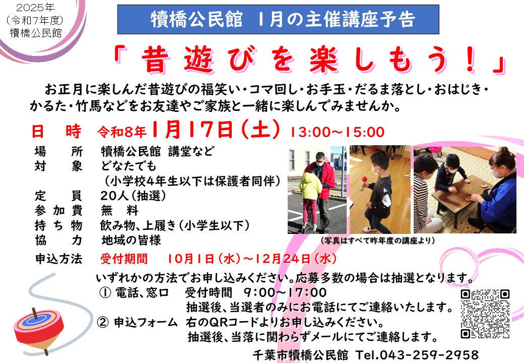 お正月に楽しんだ昔遊びの福笑い・コマ回し・お手玉・だるま落とし・おはじき・かるた・竹馬などをお友達やご家族と一緒に楽しんでみませんか。