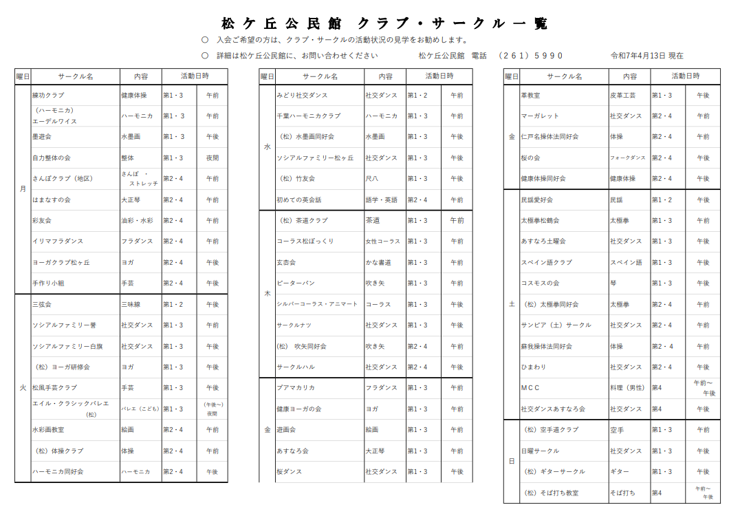 興味のあるサークルがありましたら、お気軽に松ケ丘公民館までお問い合わせください。 (TEL:043-261-5990・受付時間9:00~17:00) R07matsugaoka-club