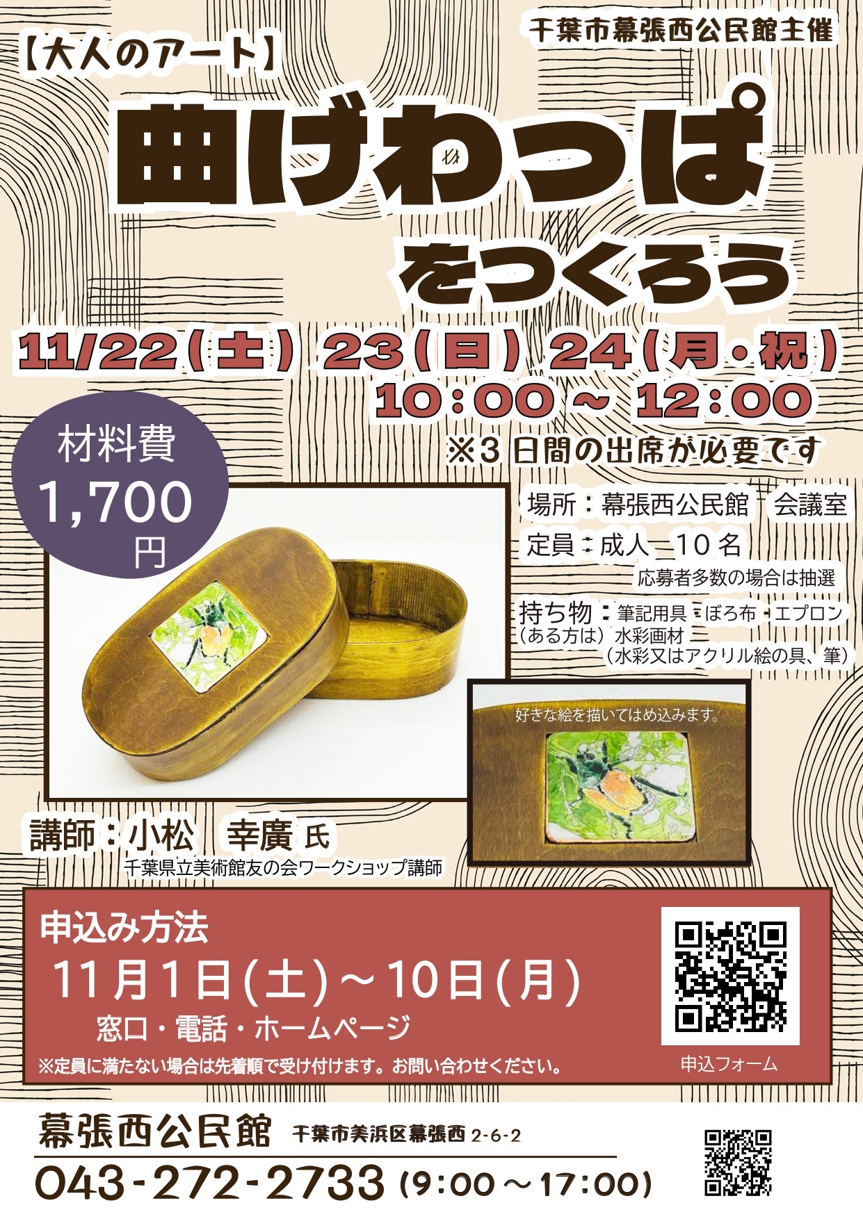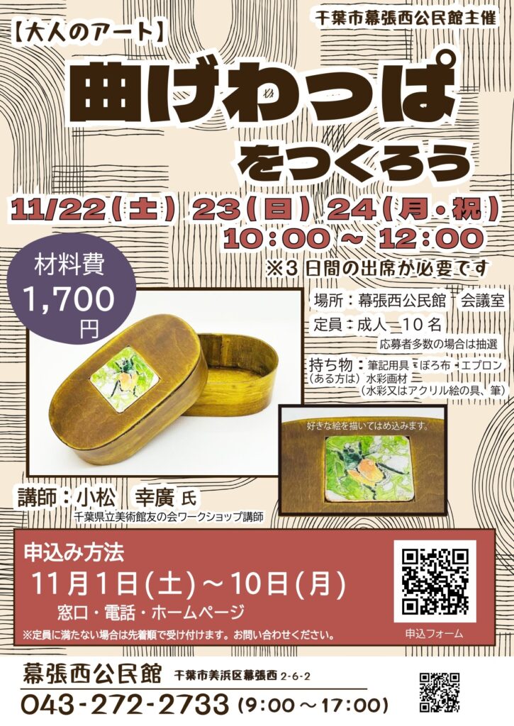 ・講座中、記録用として写真を撮らせていただきます。また、公民館だよりに掲載させていただく場合がございます。ご都合の悪い方は事前にお知らせください。 ・抽選後、メールにて抽選結果をお知らせいたします。11/15までに連絡がない場合、お手数ですがメール、又はお電話にてお問い合わせください。 【Gmailでお申込みの方】Gmail側のセキュリティの関係上、応募受理メールが届かない可能性があります。公民館に自動送信される申込確認メールは届いておりますが、ご心配な方はお問い合わせくださいますようお願いいたします。