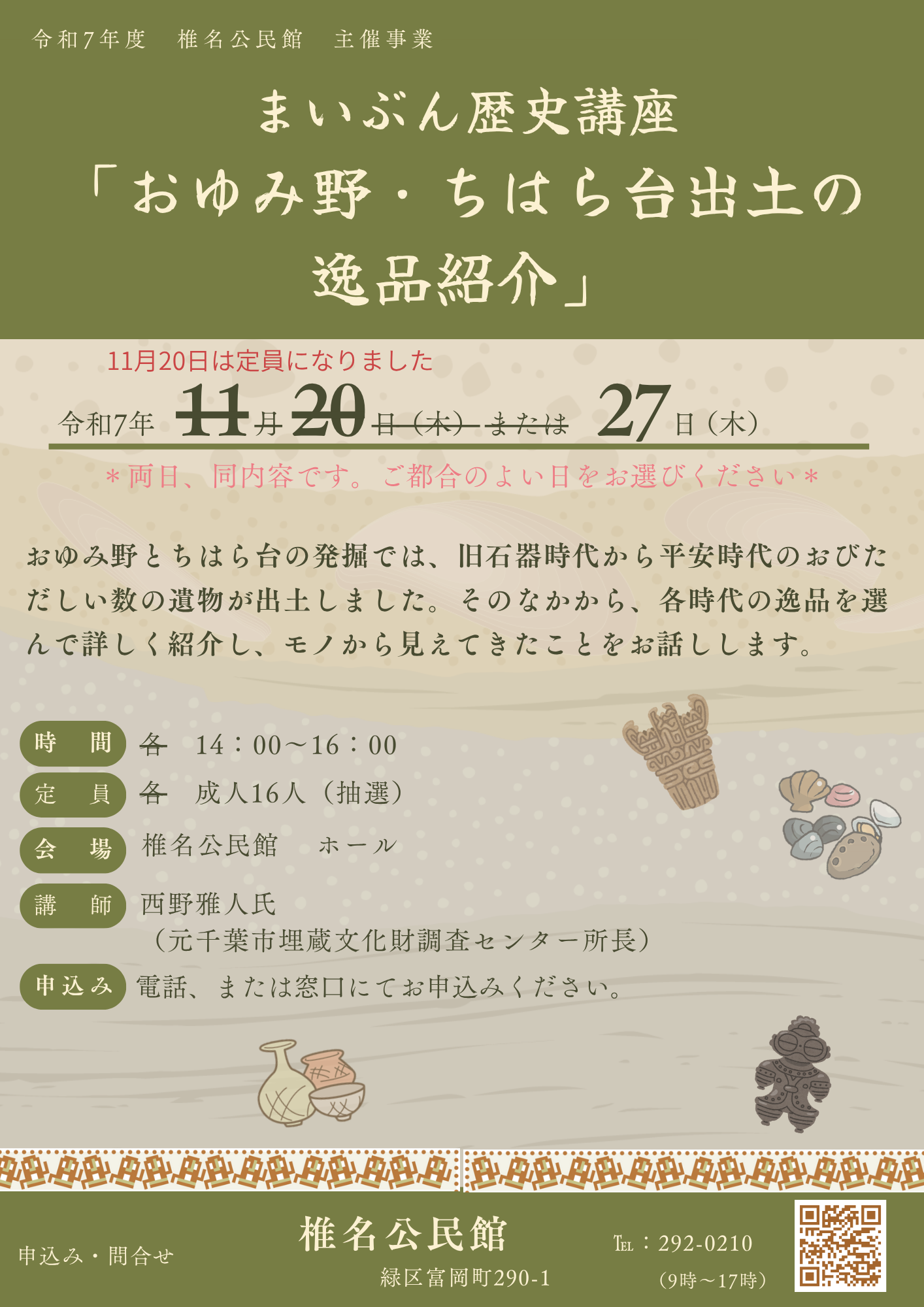 まいぶん歴史講座「おゆみ野・ちはら台出土の逸品紹介② 11/27木」先着順受付中