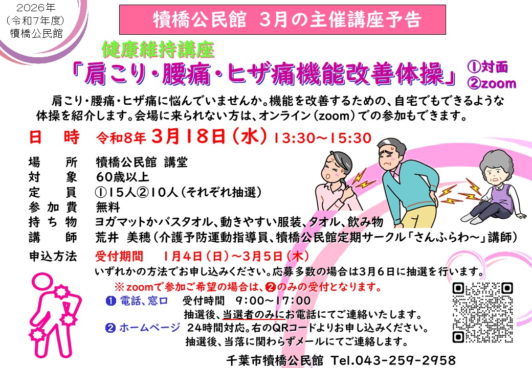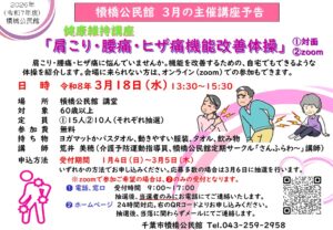 【3/5迄受付】健康維持講座「肩こり・腰痛・ヒザ痛機能改善体操」➀対面②zoom