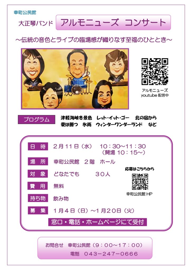 【講座応募受付1/4(日)~1/20(火)】大正琴バンド「アルモニューズ コンサート」
